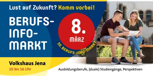 Diesen Samstag am 08. März 2025 findet der 30. Berufs-Info-Markt statt. Mehr als 100 Austeller – darunter Unternehmen, Organisationen und Bildungseinrichtungen aus Jena und dem Saale-Holzlandkreis – präsentieren und beraten zu mehr als 250 Berufsbildern: ca. 200 duale oder schulische Ausbildungsberufe, ca. 50 duale Studiengänge sowie viele weitere Alternativen. Sie bringen damit den Jugendlichen die Vielfalt der beruflichen Möglichkeiten näher. Auch die Stadt ist mit einem Stand (Nr.25) vor Ort.