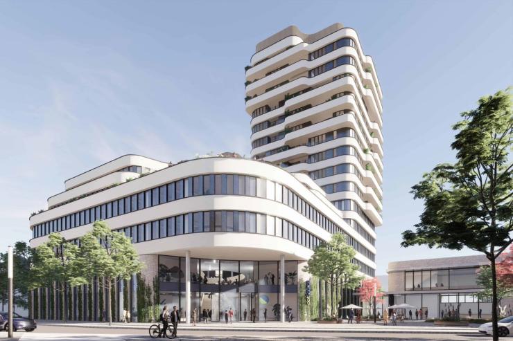 Das direkt angeschlossene Wohngebäude in Form eines Turms soll bis zu 52 Mietswohnungen unterschiedlicher Größe beherbergen und schafft somit neuen Wohnraum im Zentrum Jenas, das durch seine Tallage nur noch sehr wenig Spiel für eine extensive Bebauung zulässt. Im Erdgeschoss wird zudem ein kleiner Lebensmittelladen einziehen für kurze Wege aus dem Wohnturm und dem Damenviertel. Auf den öffentlich zugänglichen Freibereichen an der Saalbahnhofstraße lädt der »Digital Art Park« mit Bäumen und Bänken Mitarbeitende sowie Anwohnerinnen und Anwohner gleichermaßen zum Verweilen ein. Auch eine Sandkiste für Kinder soll es geben.