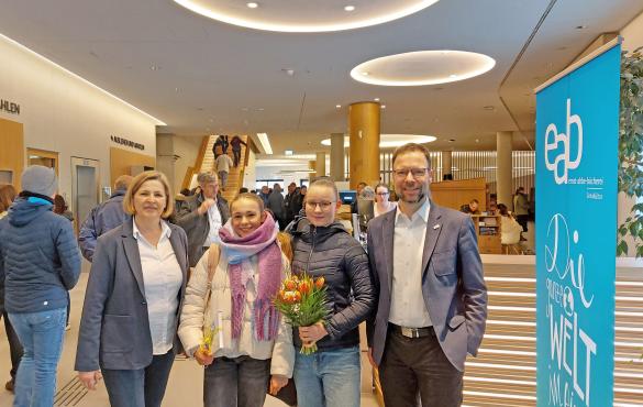 Lange bevor die Ernst-Abbe-Bibliothek am heutigen Montag erstmals für die Öffentlichkeit öffnete, hatten Sophia Sust und Emma Schwarze bereits vor der Tür gewartet. Für ihre Geduld wurden die beiden Schülerinnen mit Blumen und einem Buchgeschenk belohnt, überreicht von Oberbürgermeister Dr. Thomas Nitzsche und Bibliotheksleiterin Katja Müller. Sie waren die allerersten Gäste, die den Neubau erkunden durften. Mit den Schülerinnen strömten am Eröffnungstag zahlreiche Interessierte aller Altersgruppen ins Haus. Mitarbeiterin Kathleen Paetznick und ihre Kolleginnen und Kollegen hatten an den Theken im Foyer alle Hände voll zu tun, um alle in das System einzuweisen. Denn alle bisher Angemeldeten benötigen einen neuen Benutzerausweis. Dieser ist mit einer neuen Technologie versehen, so dass mit dem Ausweis künftig auch Kassenautomaten und Schließfächer bedient werden können.