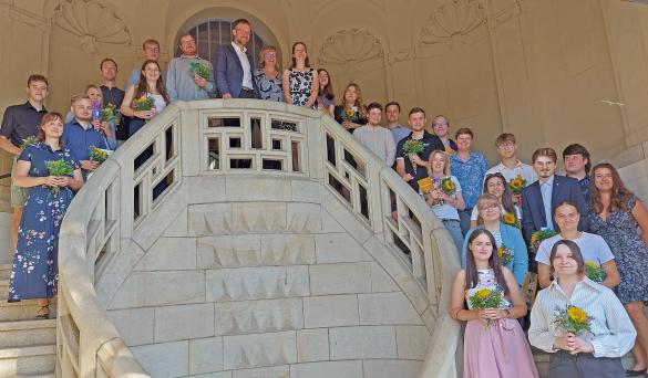 Mit der Begrüßung der Neuankömmlinge wurden am heutigen Freitag auch 39 Absolventen feierlich verabschiedet. 32 von ihnen haben ihre Ausbildung erfolgreich in der Kernverwaltung abgeschlossen – als Beamtenanwärter gehobener nichttechnischer Dienst, als Verwaltungsfachangestellte, Kaufleute für Büromanagement, Fachinformatiker, Brandmeister, Notfallsanitäter und Erzieher. Ein Student absolvierte erfolgreich den dualen Studiengang Öffentliches Management, wie auch, erstmals nach mehrjähriger Pause, zwei Absolventen den dualen Studiengang Soziale Arbeit.