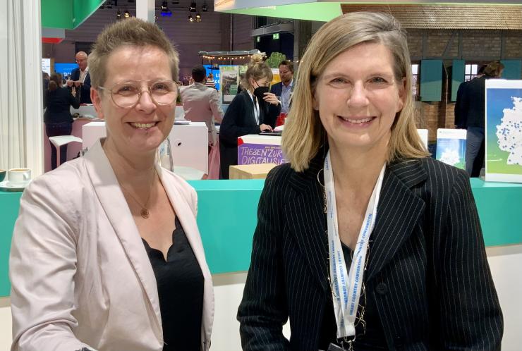 Manuela Meyer, Digitalisierungsbeauftragte der Stadt Jena (links), im Gespräch mit Renate Mitterhuber, Referatsleiterin Smart Cities im BMWSB