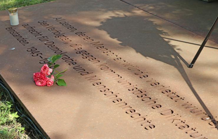 无论在哪一个纪念日,人们都会继续来到这座纪念碑前--无论是参加主题城市游览活动的人,还是学习小组、在这里献花或点亮一盏永恒之灯的受害者亲友--这一事实表明,对东德独裁统治时期的纪念和对抗并没有结束。"致所有人格尊严受到践踏的人们,致那些为了民主和人权而反抗共产主义独裁统治的受迫害者"。- 纪念碑前的金属板上写道。 为了悼念 1953 年 6 月 17 日人民起义的死难者,现在请大家一起默哀一分钟。